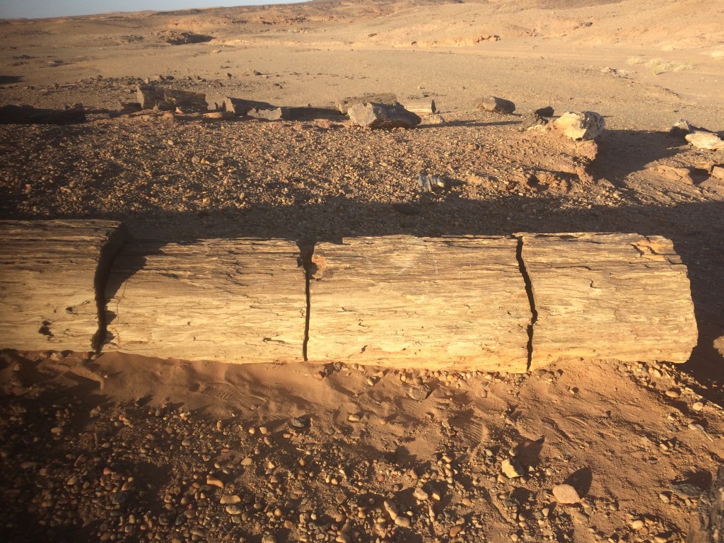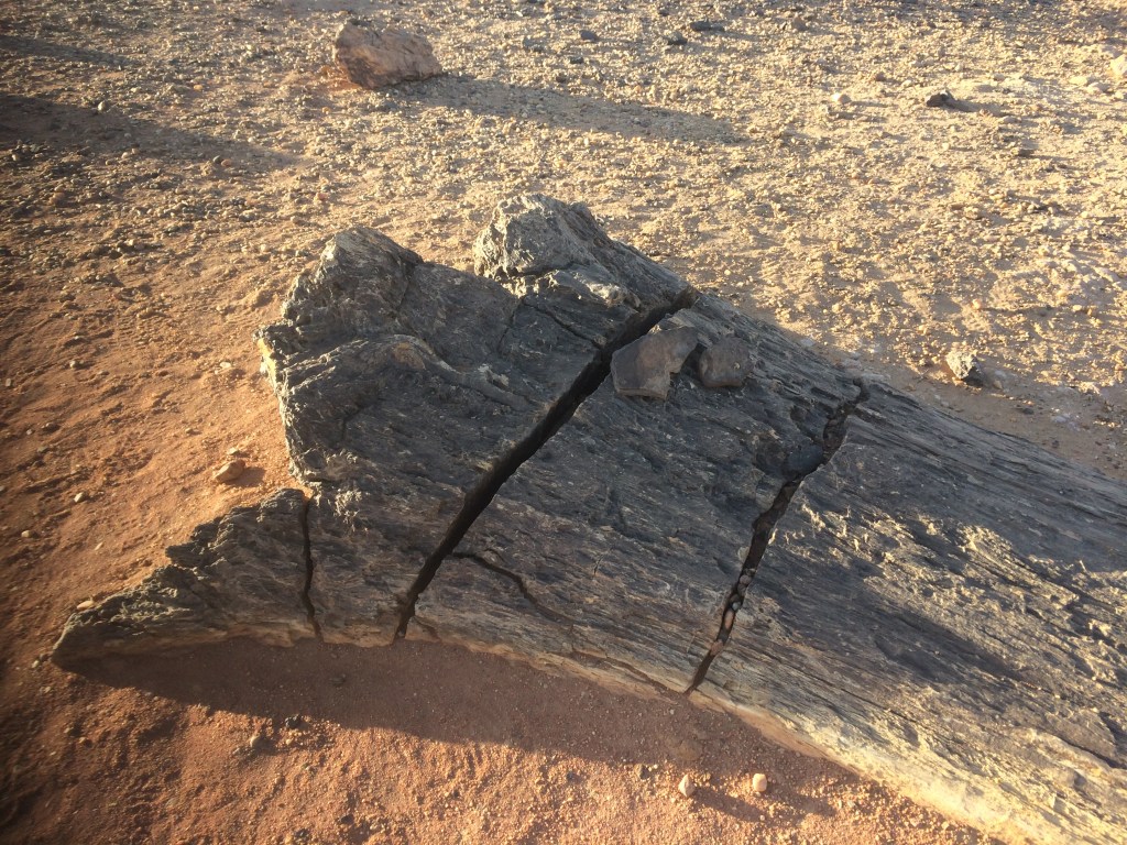 After about 4km of mildly technical off-road riding, the Petrified Forest car park (i.e. a flat spot to stop) was reached. Across the blasted and utterly deserted landscape of shallow gullies, acres of petrified logs and trees created an amazing scene in the very late afternoon. Most trees looked as though someone had come through that morning with a chainsaw and cut the logs into neat lengths for firewood. Growth rings were visible, and colours of the original wood had been retained. With some concern about riding back in the dark, I could only spend about 20 minutes at the incredible place before getting back on the bike. Half way back along the track, the wonderful feeling of lightness at having seen such a place became suspicious, and it suddenly became obvious that I’d left my backpack behind. So another 5 minutes was added to the petrified viewing before the return to the Nubian Rest House and a big cold placebo to quench the hard earned thirst.