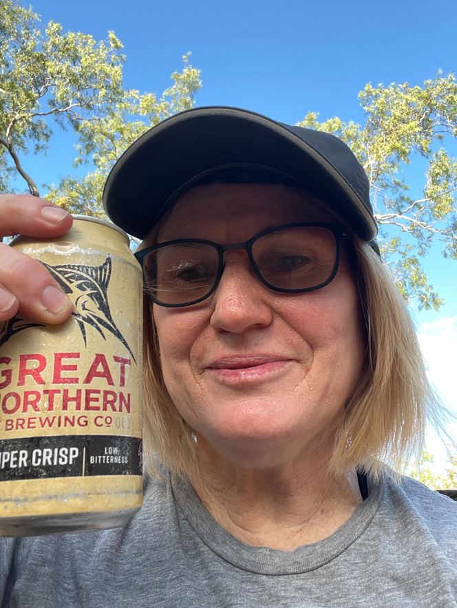 The last part of the day was a quick burst up to Kalpowar crossing on the Normanby River. This was our first camping night, so lots of new words were used during putting up of tents, inflation of mattresses, and hanging up all moist but still miraculously clean riding clothes in the laundry tree. The beers were dispensed under an honour system, just marked on a sheet of paper for final accounting at the end, and it was a real trip pleasure to always have very cold ones available immediately on arrival. Camping on the banks of the Normanby River naturally started some discussion about crocodiles, so we wandered down to the crossing and loitered about, always ensuring there was someone a bit distracted by their iPhone between us and the water. A large crocodile was spotted swimming over the other side, but by the time Ellyse had launched the drone and I had the binoculars in play it had disappeared. Dinner was wonderful, rissoles and salad making up a top burger, and once it was dark we went down to the river again expecting to see millions of reflecting crocodile eyes, but surprisingly nothing.