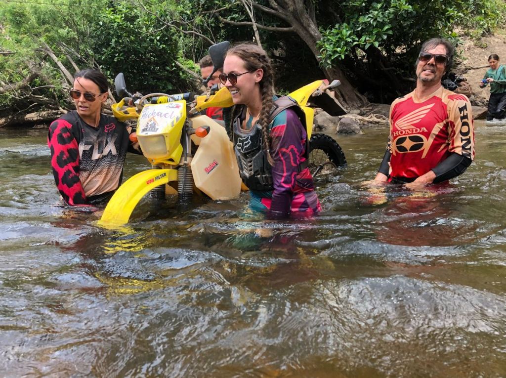 I was last in the queue, this is usually not good because everyone else chews up the crossing and it only works if the person in front shows the easy way through. Around the bend into the river, then wait, which rarely improves the outcome. Wait some more for stuff happening out of sight. Then Woody gives the signal; “Go, go!”, then “Wait, wait!”, mixed signals also rarely improve the outcome, but I went into a deep bit regardless and the bike was flooded. Woody immediately into action – push the bike out of the river, pull the carby plug out to get rid of the water in the fuel, put it in 5th and rock backward to force the water out of the cylinder via the exhaust valve, and then get the bike standing up to run the water out of the exhaust. Back on and going in moments.
