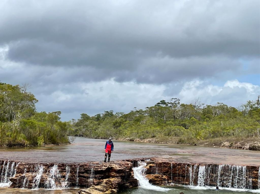Day 2 started slowly, high performance individuals like Ellyse (who has been the fastest woman in the Finke Desert Race) are usually less practiced at getting up with an overhang than we middle-to-upper-aged casual riders. A lot of pride that we can actually be way better at something there. First stop was at the amazing Black Mountain, geologists collapse with excitement at the lookout due to the absolute clarity of genesis – a volcanic intrusion has been exposed and has weathered to an amazing pile of huge boulders, turned black with algae and lichens. Then a demonstration of why it is good to travel with people who know stuff – Trevethan Falls and Archer Point south of Cooktown were great scenic stop-offs, and then Grassy Hill in Cooktown itself to stand where Captain Cook did in 1770. He was interested in trying to find a passage through the reefs for when his ship was repaired so was looking north-east, whereas we were more interested in the rugged terrain to the north-west.