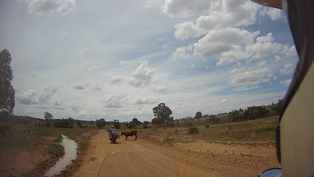 Through Anduramba, roads still not bad. Then suddenly a closed but unlocked gate. Cheaper than putting in a cattle grid I surmise. Road starting to get narrower but still fine dirt. Then the sign that held up the four horsemen of the Apocalypse for an hour in Revelation 6 – Boggy When Wet. Oh well, better than Slippery When Wet and besides it isn’t that wet. Follow tracks made by a quad bike, road changing from a road into a Kindergarten pupil’s sketch of a road. Quad bike turns around at yet another gate, surely this is the end? It is also unlocked dammit, no excuses not to continue. This is the first time we have had to actually stop and look at where the GPS wants to go, the track sometime turns into whatever the opposite of a track is. The GPS trucks no such hesitation and drives us on. To yet more closed gates, but all happily unlocked.