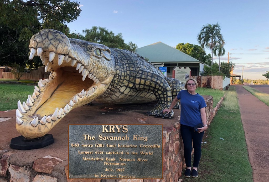 Into Normanton, it immediately became obvious that we’d beaten the mass of Gomads north when we checked into a mainly empty Normanton Tourist Park. The pool was once again priority 1, it was still rather bordering on very warm out on the highway. Refreshed, we decided a wander through town was in order to get a feel for Normanton, of which our collective knowledge was nearly zero. We had a drink in the Purple Pub to quench the heat-induced thirst while learning a lot about the current staffing challenges in Normanton from the barman, then thought about having a meal. A visit to the life-sized statue of Krys, the largest crocodile ever taken, then had us thinking about being a meal, but for an 8.63m (28 ft 4 inches in the old money) crocodile we’d only be a small part of a seven course degustation. A real understanding of what the people in Jurassic Park experienced.