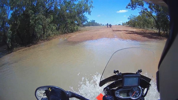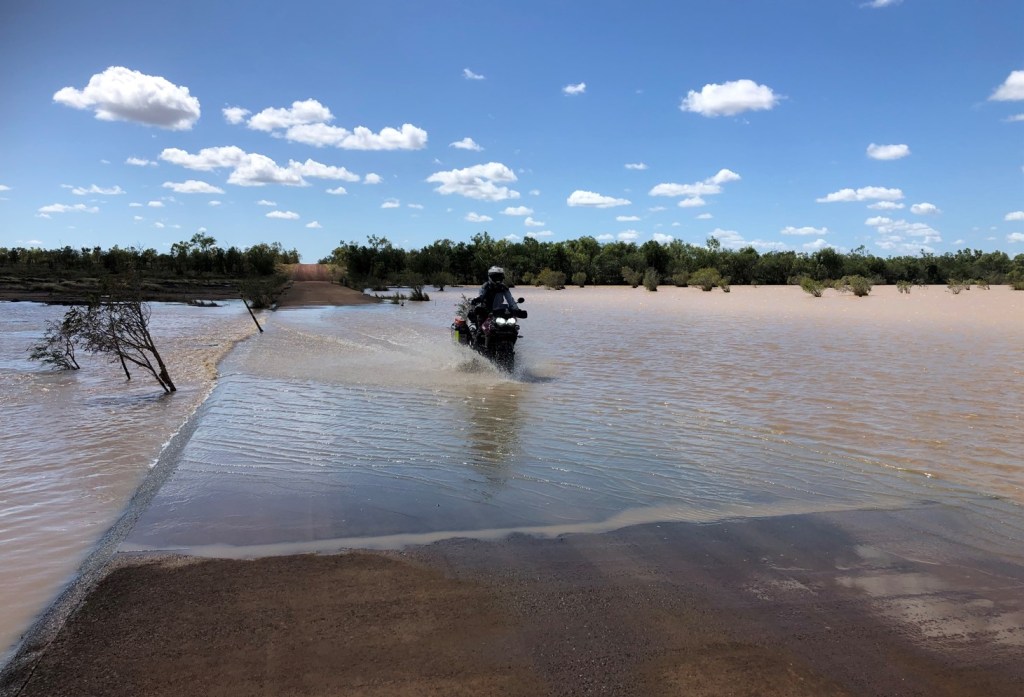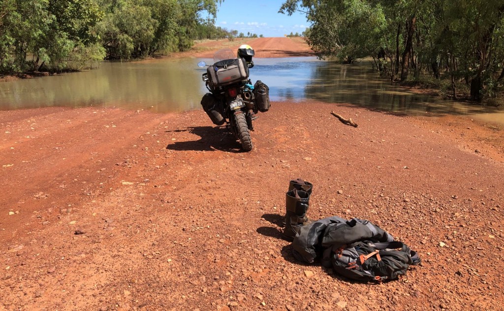 Off the bitchyouman, the Savannah Way was dry, smooth-ish between ruts, and good riding. Road works is happening to upgrade it, and as it is Highway 1 time is ticking for remaining as dirt. The stressful bit was near the end. The QLD roads website was a bit like a WhatsApp High School group chat, it had very vaguely indicated that things might be happening around the Leichhardt River, but no-one had actually seen Wayne and Cheryl pash, so everything was just wild speculation. And then over a rise the “golly gosh we might have to turn around” situation; a 30m wide water crossing. Possibly the more confronting form of golly gosh was used, the version not tolerated in primary school discussion. Hmmm, could be way deep, insane to ride straight in. Hmmm, we are in saltwater crocodile country, Angry Son of Krys possibly in the ‘hood. Worth the risk to wade in and check it out? Or just ride back 140km to Normanton and start again? Luckily I knew that no-one carrying a stick had ever been attacked by a crocodile, so the risk was practically zero-ish. Off with pants and boots, stick held in the stabbin’ position, I walked back and forth a few times to make certain there were no big holes. Nothing over knee deep, out I came. There would be no turning around yet.