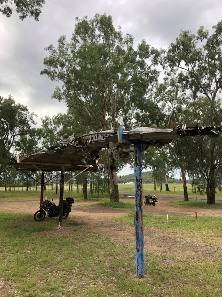 The Gulf Development Road turned out to be dripping with population centres, a second lunch had to be taken at the old gold mining town of Croydon simply because towns of that size cannot be ignored when travelling that far north. Riding motorcycles with all our equipment strapped and stuffed on, we parked near an RV named Migaloo (the white whale). It was a proper full-sized luxury bus with no doubt extensive living areas for the two people seen getting in and out, but that wasn’t all. It was towing a fair-dinkum 4WD so that the bus could be parked, creating a new apartment complex and driving up local real estate prices, and the 4WD driven around like every other tourist’s out there. Given the price of diesel was around $2.50/l out in the scrub, all eyes staring at Migaloo began watering when someone mentioned refuelling.