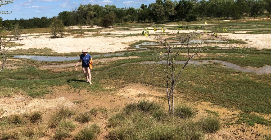 Into the pool, then a walk down to the Burketown bore. Drilled in 1897, and running ever since, the water is very hot at 68°C and unfortunately only drinkable by adult cattle who probably prefer something else as none were sighted. Cindy decided a wander into the wetlands was in order, oblivious to the danger of wearing plugged thongs in hot slimy mud.