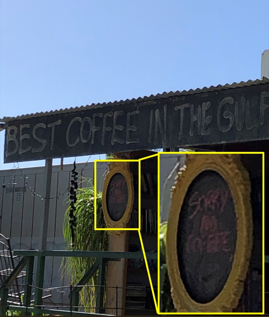 The pub shut at 5pm so dinner was back at the take-away after a few refreshing beverages with our host. Up the next morning for a nice breakfast, it was a true pity to have to leave, Burketown was definitely an unexpected highlight. It was a public holiday so still little open, but we managed to get fuel and get to the boat ramp on the Albert River, about as close to the gulf as Burke & Wills got. South the mere 120km to Gregory Downs, where hopes were very high for coffee. The Gregory Downs races and the annual canoe marathon had only just been held on the Saturday, and a sign saying “Best Coffee in the Gulf” had us swarming in. Shame we missed the disclaimer sign just below.