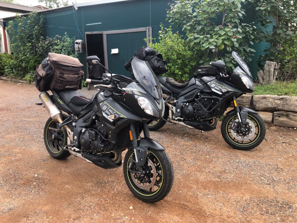 The weather held off as we pulled into Carnarvon Gorge, with an exciting creek crossing to get into the camping ground. We were in a glamping tent with an ensuite, a decision that would later to be proven very sensible. The shop contained a full selection of wines, and more Pringles, salted peanuts, and jerky so we didn’t need to buy anything, but the dinner options were looking a bit sodium enriched. We pulled up to the glamp tent, deciding that no-one had specifically said we couldn’t take the bikes through the fence and parked them alongside.