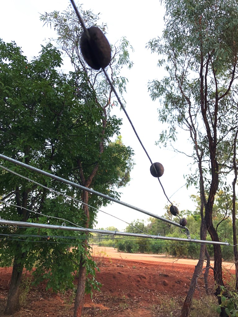 Two miracles occurred at the Undara Lava Tubes. The first was a large tour group had been delayed, so we scored an upgrade into luxury converted train carriage accommodation, and the second was a triumph of nature over wet clothes. The rising heat had demanded a swim while the washing went on in the communal laundry. No dryers, a clothes line, but no pegs. Most Gomads believe that the Black Death started when Beryl Harris borrowed Mavis Jones’ pegs to string up her smalls outside the Jayco at the Cotton Tree van park in 1973, so little hope of borrowing any. Then a passing chap mentioned that Mother Nature herself had visited Undara at the end of her clean clothes cycle and had the same problem, so created the peg tree. The trees are everywhere, and the round nuts with a big spilt are basically a clothes peg. Perfect.