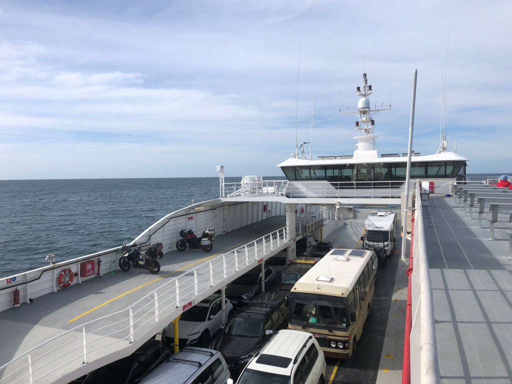 Chain adjusted in world-record time, we punched on to Lucky Bay, thankful that we’d stopped at all the little towns like Port Neill and Arno Bay on the way down to Port Lincoln. Made it to the ferry comfortably, but were horrified to discover we may not get special treatment and had to line up with everyone else. We were completely clueless about the ferry details, except that it left from Lucky Bay and motored across the Spencer Gulf to Wallaroo. Was it a “basics” ferry or with enclosed passenger seating? Café and dining or BYO? Just in case we bought some chips, although only the packaged variety and therefore lacking the local speciality of chicken salt. It all turned out well, we got our own “bikes only” deck, the ferry was well appointed for the 60 km journey, and included a pleasant lunch.