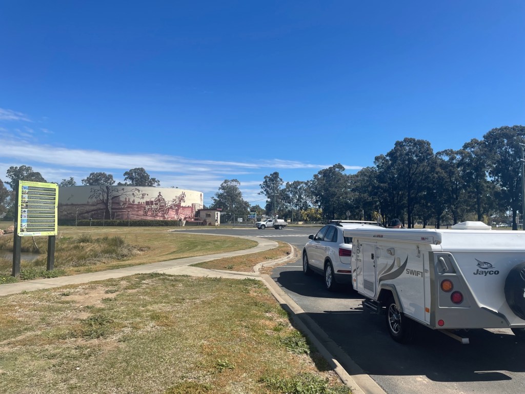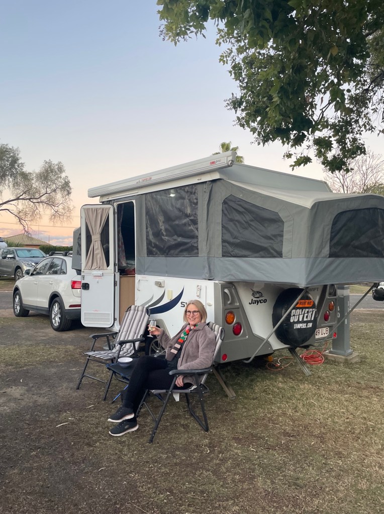 Heading into Narrabri for our planned overnight stay at the Big Sky Caravan Park, I had us in a drive through site due to our lack of van reversing experience.  The instructions for erection remembered well enough we were soon seated on our camp chairs with a white wine, beer and nibblies giving ourselves high-fives.  Later on at the camp kitchen while cooking our steaks our neighbouring van folk were told it was our very first ever night in a caravan so a round of applause was in order.
