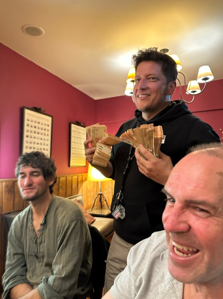 Laughing hysterically as someone’s Italian wallet exploded after being stuffed with $20 USD worth of pesos
