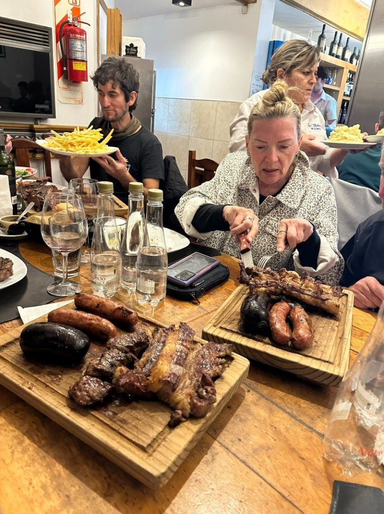 Back onto the road like we now owned it, it was the loop with some of the clearest and most amazing scenery, before back to the hotel and preparation for the evening. One of Bariloche’s premium carne restaurants in a country famous for carne was the plan, so those with “double wide” pants and tracky dacks had them laid out in readiness. At 7:30pm we were in the queue, waiting for the very early opening by Argentine standards; 8pm. Doors didn’t actually open until 8:10pm, but it was worth the wait. Seated, several cuts were ordered, and then relentless plates started to appear. They never ended, as soon as 3kg of carne was consumed, out of the kitchen it would reappear. Eventually (about 15 minutes in) we were frightened to touch anything because it would have a re-in-carne-tion. Okay maybe they won’t notice a small black pud missing. Oh lord they did – here comes another wooden platter. “Elegant Sufficiency!” someone moaned, their pants parting like the Red Sea in Exodus 14:21, but without any chance of Egyptians drowning in a zip-up.