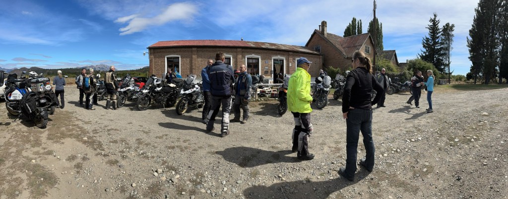 Day 7 was the start of Patagonia although we didn’t realise it at the time. Up at 6am, casual breakfast, away by 8:30am. Due south out of Bariloche which was easy, and down through the lakes the same as since Pucon, suddenly trees started to disappear. The lunch plan was complicated – we would meet with the last north-heading Compass Patagonia Explorer group for the year at the turnoff to Butch Cassidy’s old digs, have the luncheon, then go back to the turnoff to meet the final group member Scott who had not been seen since Santiago due to his bike being held hostage in Miami. Scott had been escorted in two days from Santiago by Tomas, a Chilean BMW riding champion. Speed was of the essence. All went smoothly from our perspective, rolling into the Butch Cassidy property in a huge crowd. Lunch and meeting with other riders – Maslow later admitted he should have included these in his hierarchy slightly above craft beer. A great group, they had done it really tough with some of the worst winds for years. All we could tell them was it was going to be easy from here on, except for the traffic.