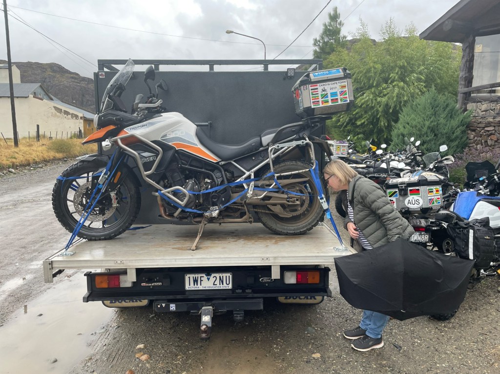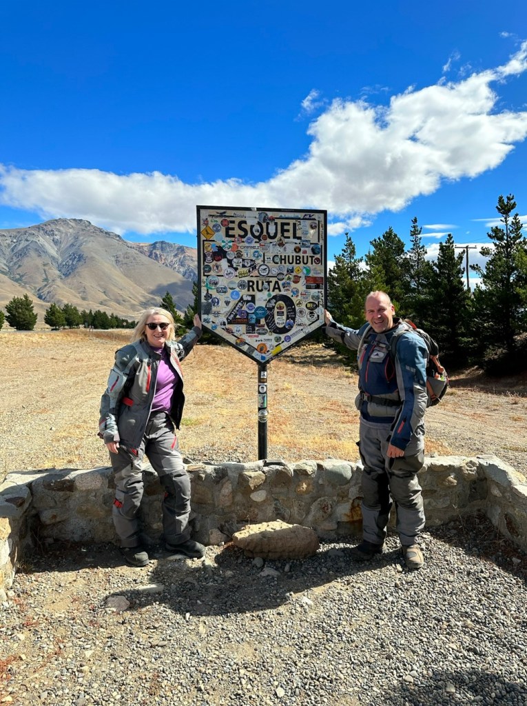 We had a ball, the road was a lot easier than the previous day except for a straight just before the tiny section of bitumen. Confusion reigned – were we supposed to stop there? No was the consensus, we were supposed to meet up at a viewpoint over a lake. Tragically we missed the viewpoint, and by the time we’d figured out we’d missed it we were miles along. Never mind, keep going until we reached the end of the gravel and found the servo at Tres Lagos. We never saw any lakes let alone 3. The group eventually caught up with us, and news came that Cindy has crashed, luckily only a bruised rib – but after she’d ridden on to the lake viewpoint she’d discovered the bike was badly leaking oil so it was up on the truck.
