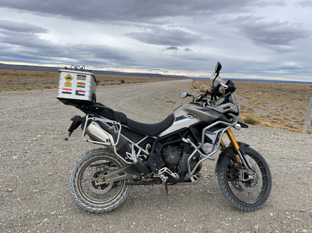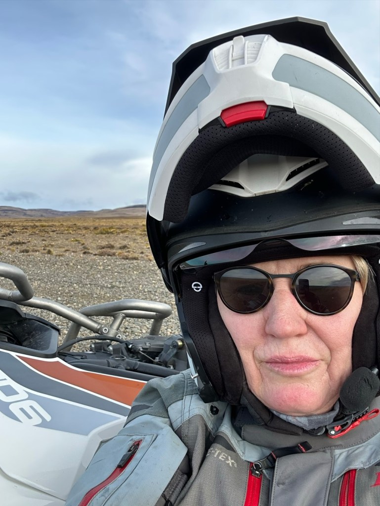 The warnings had been coming on strong about Day 8 for a while; we were heading for the town where paper picnic napkins have the lowest take-up on Earth – Perito Moreno. The wind heading to the lunch stop at Rio Mayo was just brutal – 80kmh. And as we could really only travel North-South and the wind could only travel West-East, we were unlikely to become friends. Lots of physics studies and vector analysis made it more bearable; motorcycles are designed to head into the wind but the side force made it important to try to get the head pointing into the apparent wind direction about 15° toward the wind to stop the buffeting. Rio Mayo lunch was planned as a picnic out of the truck, but wasn’t going to happen, the wind even in town was just nasty and Cindy was blown over at the servo, so inside a restaurant for shelter and very nice salads and chips. Back on the road, the true challenge of Patagonia’s winds became apparent; stopping is truly scary and needs a lot of planning. As we had a nearly straight on head wind in one section, I decided to pull over and take a photo of the barren landscape. The bike wasn’t quite straight on into the wind, which was coming in slightly from the side-stand side, so leaving it was considered a really bad idea and photos were taken pushing against the side. Then a glove got loose. Within a few seconds it was 50m away. Thinking through it, this was simply a fusion of Sophie’s Choice with a bit of Sisyphus boulder rolling thrown in. Both just went for it, so I did the same and raced for the glove hoping a gust wouldn’t happen, and it didn’t. No dramas.