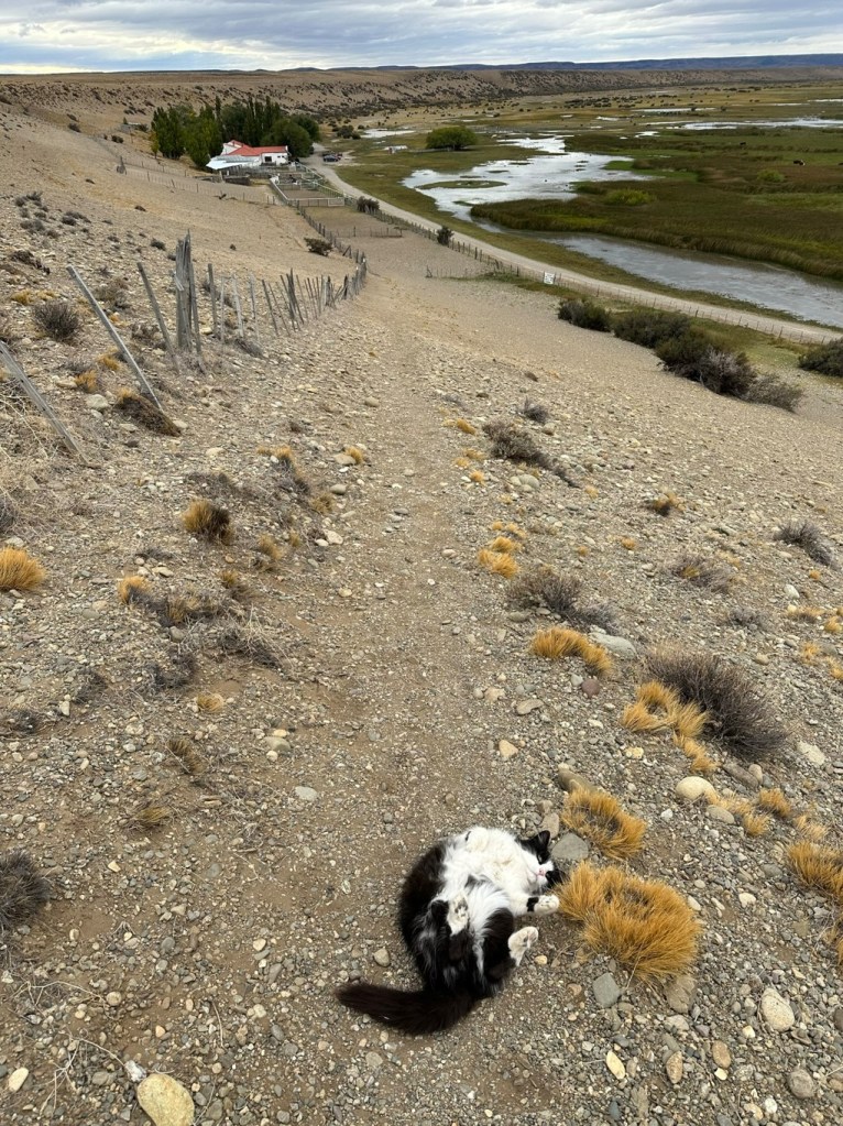 The Estancia was a beauty. Situated in a river valley between mountains of river pebbles, there were horses, cows, and sheep. And cats. Lots of cats. A walk up onto the mountain of river pebbles gave great views, before we were escorted back to the Estancia by a one-eyed cat. Dinner that night was another epic meat extravaganza washed down with a few reds, and sleeping well as a result. Up for Day 10, it was cold. Bloody cold. Ice on the motorcycle seats cold, and a bit damp from some overnight rain. The start was delayed by ½ an hour – we had 40km of gravel to get to the main road, apparently with some clay which could get slippery, then 50m of bitumen, then the last remaining Ruta 40 gravel section of 73km. JC decided to lead from the back in case there were dramas, so Scott with Gina, Rex, and I (the only one with a working GPS) were tasked with opening the piste.