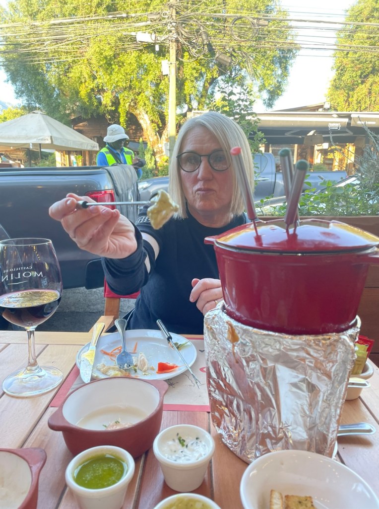 Getting the mandatory daily Pisco Sour was no challenge in Pucon. Everywhere including children’s clothing shops could serve you a strong one. And finding somewhere to eat was likewise not difficult, but we decided to fulfill a decades-old dream – a fondue. In hindsight we went for the wrong option of the carne (cow) and pollo (chicken) with sauces, a queso (cheese) fondue at the next table was looked on with envy. But spearing and lightly par-boiling pieces of meat in a pot with large lumps of celery, carrot, and capsicum for just long enough to drop the bacteria’s guard was still pretty good.