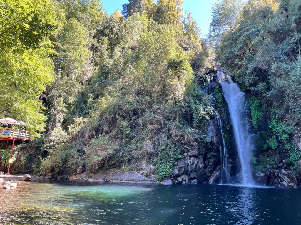 Day 4 plan was some cruising around the Pucon district, starting with a ride up to the Playa Negra (strangely way whiter than the Playa Grande) in Lagos Carburgua. Luckily arriving just before the parking payment station had been set up, we wandered along the beach and had a local explain to us in Spanish that no water craft hire was available due to the strong off-playa winds, somehow we understood even though we had absolutely no intention of hiring water craft and didn’t care. Next it was via some back road dirt with some rustic scenes including getting stuck behind a B Double (a two bullock wagon) to Tres Saltos – the reader now familiar enough with the language to know this means three waterfalls. We can definitely confirm two, but the third was way out of the extent of our motivation. The restaurant had two big spits going out on the deck with lamb on both, a perfect lunch and it smelled awesome. But it was for a private do so we couldn’t have any. I hope they all got lamb grease burns and were attacked by condors on the way back to their cars.