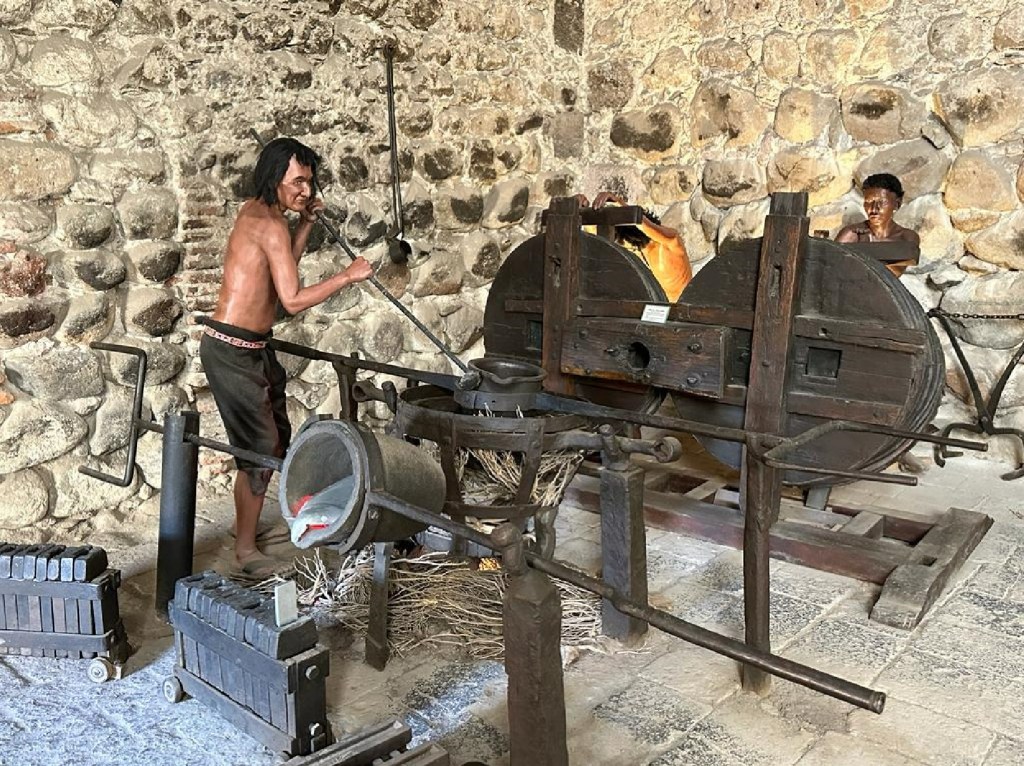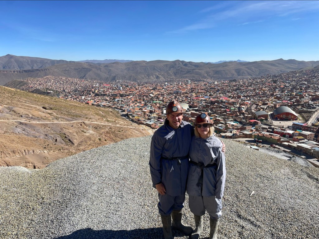 Day 53 was the Potosi mine tour. One of the world’s great deposits, it has produced around 65,000 tonnes of silver as well as lead, zinc, and tin, and killed and still kills and shortens the lives of uncountable numbers. It is all underground now, and so the co-operative mining still has to abide by certain universal underground truths; ground support, running services (air and water), clearing areas before blasting, and allowing dust to settle before moving back in. That said, the old-world conditions make it an interesting place to visit. Firstly we had to buy coco leaves and 96% proof alcohol and soft drink, and what is universally called dynamite, safety fuse, and small bags of ANFO (ammonium nitrate mixed with diesel) for the miners. Then into the underground gear.