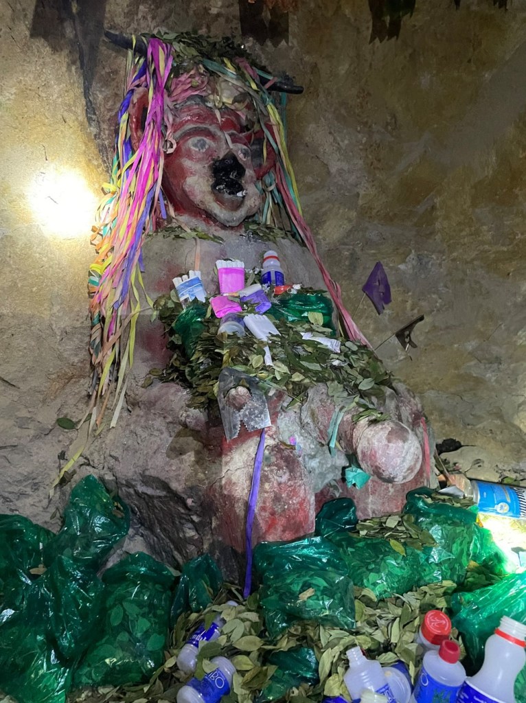 Down pit, it wasn’t as bad as thought, and expectations of being taken into a drive “sanitised” for tourists was quashed as soon as we had to get up against the walls to let ore carts pass. The miners get their own working areas, with drives locked off and presumably some system in place to keep common areas and services in good condition. First duty was to see and make offerings to El Tio, The Uncle, Lord of the Potosi Underworld, who like most deities needs a bit of attention to keep things running smoothly. El Tio has a diet and lifestyle which would be described by Keith Richards as “sound” – he survives on coco leaves, ciggies, and 96% proof alcohol, and possibly some Viagra if the visual evidence is reviewed dispassionately.