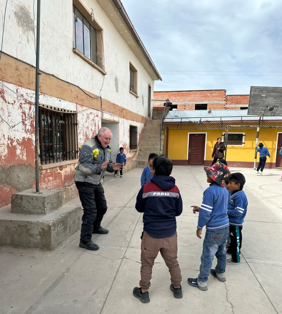 Across a wet flat land covered with llama, which nearly became a photo obsession except the llama would have been miniscule, why doesn’t the iPhone show things the same size as the eyes, and into the tiny town of Chaquilla. This is a regular Compass stop to support the local school; we’d bought some general supplies in Potosi to give to the teachers. These sorts of stops can be a bit awkward – wealthy motorcyclists swanning in and showing Bolivian children a life foreign and impossible for them, but kids will be kids and we all had a ball. Especially the kids getting a ride around the square on JC’s bike, several went around several times and continued to queue up.
