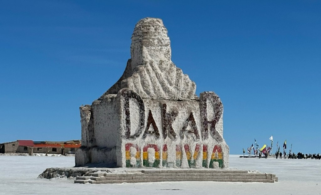 Day 55 was inevitably the Salar de Uyuni salt flats tour, and because the salt flats are jolly large we had to get into it early, firstly to the train and rollingstock museum out on the edge of the flats then visiting a small artisanal establishment made of salt blocks which unsurprisingly makes bespoke salt – bespoke normally an excuse to have as much stuff that isn’t salt in the product as possible. Then out onto the flats proper, with puddles of hypersaline water noted by all who had been considering riding out; certain death for motorcycle electronics. To the Dakar sculpture, there were lots of bikes lined up but none were owned by someone who’d got their motorcycle bogged in a salt lake in Western Australia in 1996, they knew better.