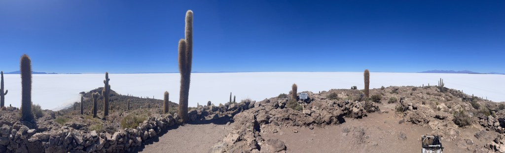 Driving out onto the salt flat is amazing; there is just nothing but salt flat, and by topographical standards it is extremely flat. Suspension not required flat. Snow blindness is an issue, so we’d all stocked up on sunnies for the 71 km drive out to Isla Incahuasi in the middle, not much to see except lots of flat white. Arriving at the Isla, the crew set about assembling lunch, while we climbed to the highest point to get photos of huge cacti and more flat white.