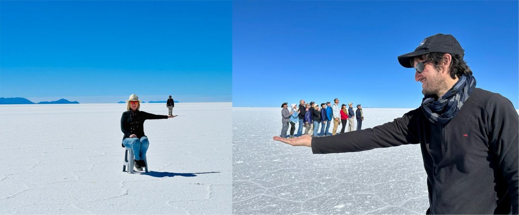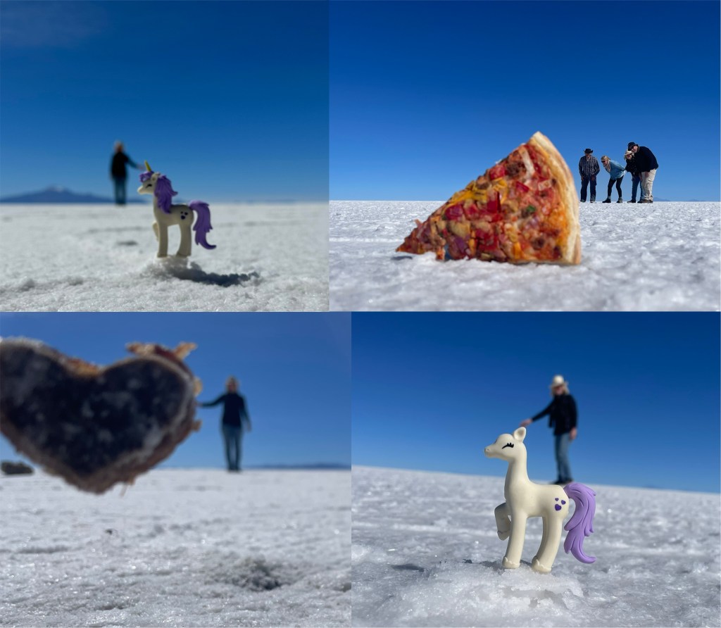 After lunch the standard Salar de Uyuni activity began; doing weird perspective photos. We’d pre-prepared for this with a variety of props, but one thing became immediately apparent – having a very small thing in the foreground makes the focus issues a lot more complicated.