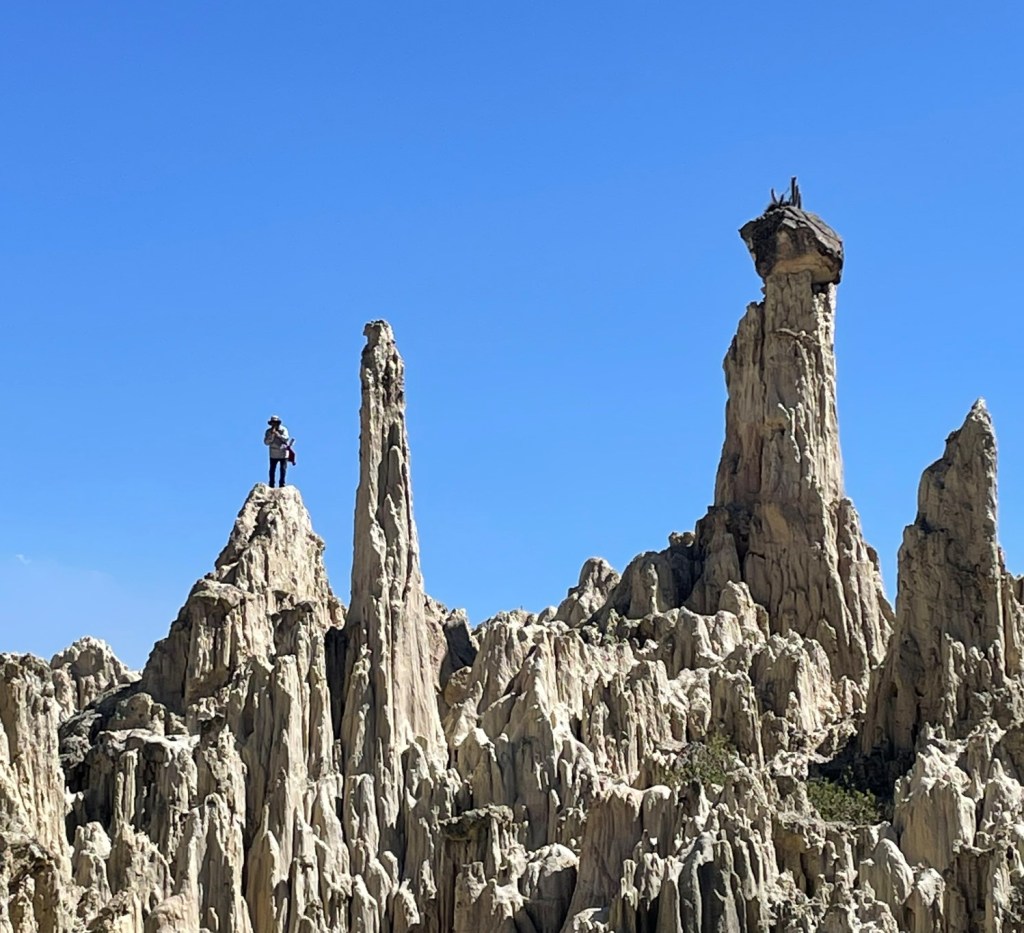Day 57 was a city tour day, starting with a south-eastish trip to see the Valley of the Moon. A lot of La Paz is built on clay sediments, but this a particularly soft part with water erosion making some very interesting formations, which only survive due to the low rainfall in this neck of the lack of the woods. Inevitably some local started up the pan pipes from the top of one of the rock-capped pointy bits near the end, which had us trying to find another way out or sneak past him while a trapped unfortunate gave him a few BOB.