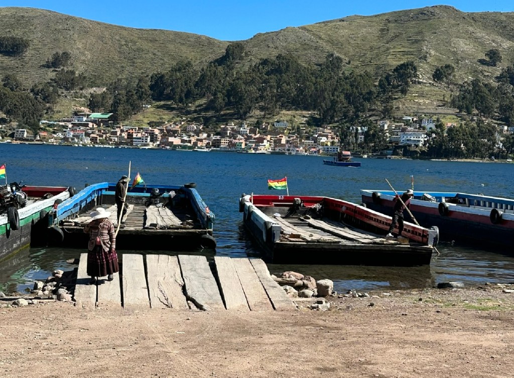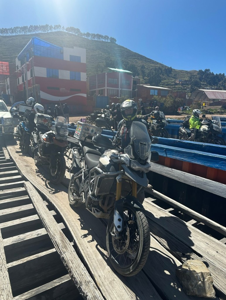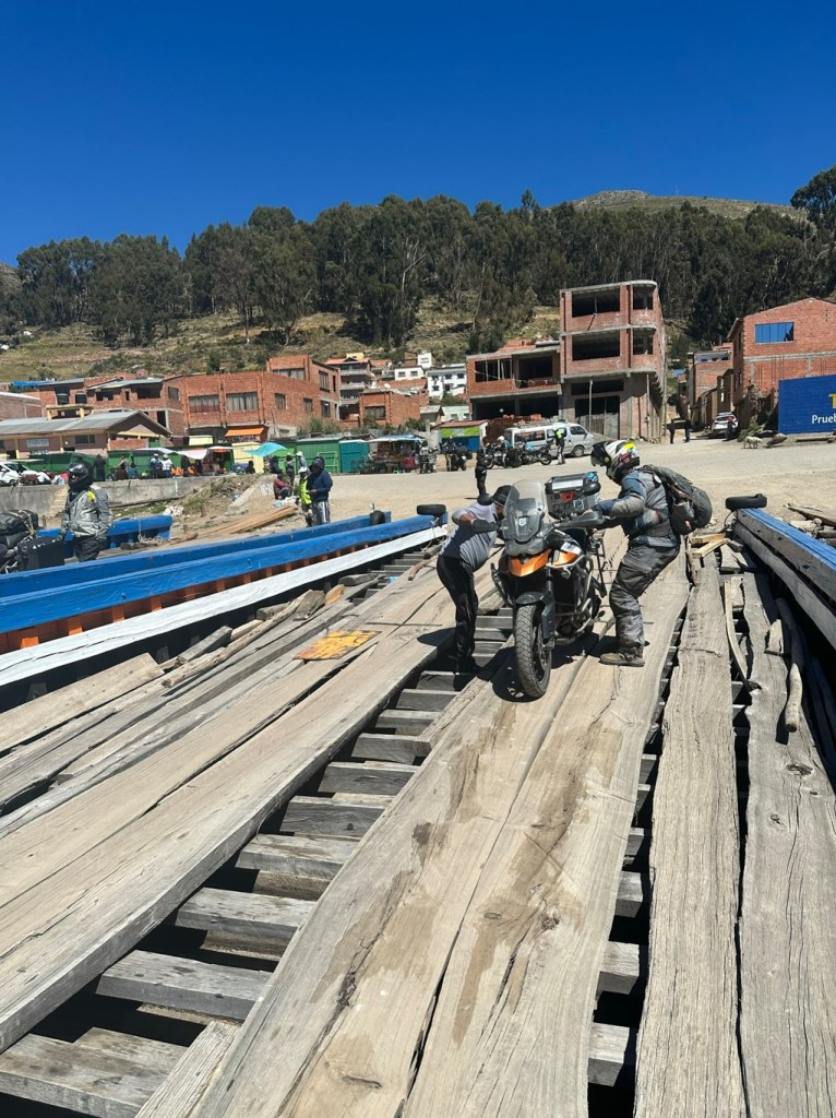 Another brief comment about Bolivian business which adds to all the same shops selling exactly the same things being right next to each other. It is not acceptable for companies to set up large shops with the exception of dealerships for cars, almost everything is done by sole traders in co-operatives or just on their own. So rather than have one well-designed big ferry cruising back and forward across the strait, there are lots of questionable wooden barges driven by outboards that share the ferrying, taking everything from buses and trucks to cars, motorcycles and walk-on passengers across. The ferry deck is beams going across, with long and very shonky planks of eucalyptus with terrifying gaps either side and splits down the middle. Once our craft had made itself available for loading, it was a scary embarkation mainly because the loading ramp board ends didn’t align with the barge board ends, sometimes giving a 6″ step up which needed warp speed to get the bike over then instantaneous stopping before disappearing down a huge front tyre-width gap between the boards. No riding for the faint of heart.