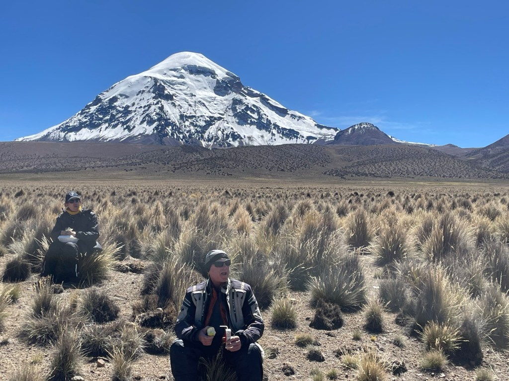 Day 61 we were up really early, and back into the bus for the steep climb back up to the bikes. Anna-Maria’s driveway renovations had progressed, with the architect choosing fashionable baby-head sized boulders for the top-coat, which were nervously looked at during a non-servo re-fuel and re-pack. Heading out, there was only one minor drop so only damage to pride, then the ride back south-east to Patacamaya where we’d take a 90° turn south-west to the Chilean border. Unfortunately missing a photo of the Taxi Aroma shop, presumably selling modern taxi scents such as Eau de BO and Old Vindaloo Spice, we re-fuelled for the last time, ironically very easily. Off toward the border, the scenery became frankly spectacular, especially when the high Andean volcanos appeared. A stop for lunch just before the border truly was a highlight lunch for the entire trip – especially with grass clumps that were incredibly comfortable just to lie down in.