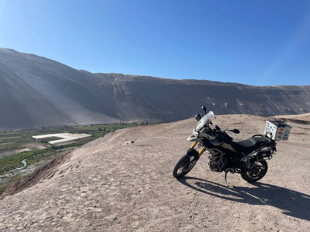 Over to the border crossing which is at the highest point on the Andes ridge line, we were out of Bolivia reasonably easily, and back into Chile for the uncountableth time after dragging every bag out of the truck and through the X-Ray inspection without the benefit of being able to breathe. Then the descent on the winding road through the rocky mountain slopes and down into the Atacama Desert, this was truly some of the best scenery we’ve ever ridden in and can only be described as a land of giants – everything appears at a much larger scale. Riding along the Rio Lluta green ribbon added to the contrast with the utterly barren and sterile Atacama landscapes.