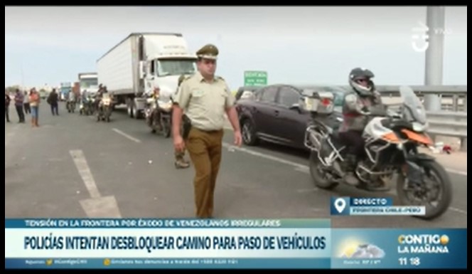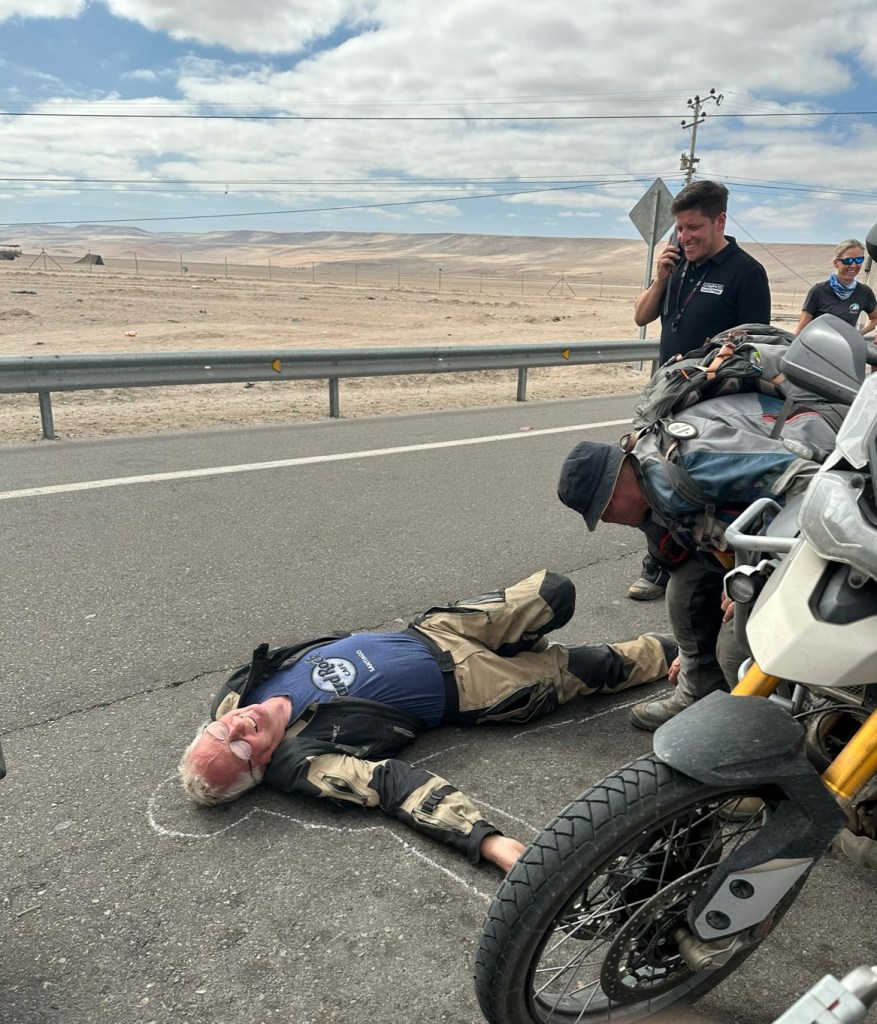 Up on Day 62, the plan was a border crossing into Peru and a mere 50 km to ride into Tacna, where we would wash the bikes, load them on a truck, and despatch them by road to Lima while we gallivanted around the country by aircraft and bus to avoid political and protest strife and damaged roads. We got to the border and joined a disturbingly long queue of cars trying to get into the border station. It didn’t move, then just as things started to be taken off in the heat cars would suddenly move a few places up. Normally not a problem, but people in cars in this queue were hyper-aggressive and would literally drive around a motorcyclist to push in. Then a big delay, and again things were taken off in the still rising heat. Binoculars showed there was something going on further up with crowds at the entry to the crossing. A bit of horseplay and buying water and things from the wandering vendors kept us amused, before suddenly all hell broke loose and everyone started racing for the border. David and I were at the back, but managed to get past the cars and trucks and military and police personnel until one particularly officious character made us stop and put our helmets on, allowing many vehicles past again. Arriving into a park just before one extremely aggressive and angry driver, he then decided to just block us in to prove his machismo.