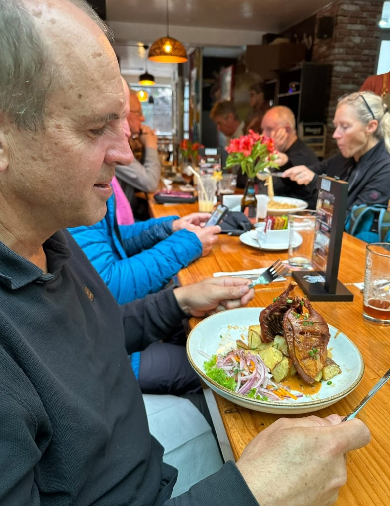 Clouds gathered which made this sacred place seem quite other worldly and while we have all seen the iconic pics it did not disappoint and it is truly an epic 15th century wonder. After our allotted time it was back onto the bus of death (and sitting in the front suicide seat) for the trip down the mountain. A delicious lunch followed where Duncan tried the local “delicacy” of Guinea Pig or Cuy as they call it. We had seen roadside vendors with Cuy BBQ-ing outside, a somewhat pitiful sight for those who remember them as fun little pets, although these ones are bred for eating and are larger in size than what we are used to. They do look a bit like naked rats or dachshunds when mounted on the rotisserie.