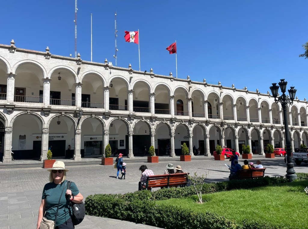 The following day was our flight to Arequipa, known as the White City due to many buildings having been constructed with the local white volcanic stone. A visit to the town square to try and find somewhere to change USD to pesos, there was a distracting local ice cream delicacy which contains egg yolks so very rich and was the order of the afternoon. Arequipa is very picturesque and surrounded by 3 volcanos with one still active. It is also a major commercial centre for the mining industry with one of the biggest copper mines in South America close by.
