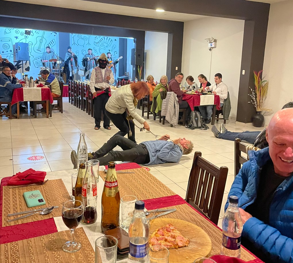 Dinner in Chivay at a rather touristy restaurant with a cultural “show” was an eye-opener with performing couples dance-fighting and flogging each other with rope. When audience participation was called for, Paul and Allana were up and in no time Allana had Paul on his back on the floor and was giving him a sound flogging. Not saying that some knotted rope blows went a bit low, hang on, that’s exactly what I’m saying, but their relationship withstood the test admirably!
