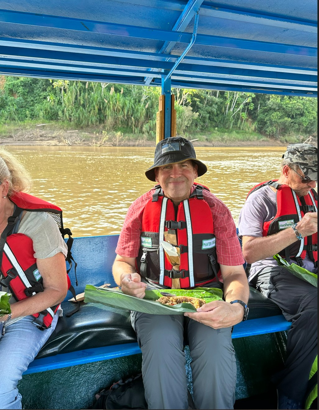 Our accommodation for the next 3 nights at the rainforest resort was an open sided lodge directly to the rainforest and we were warned to lock food up as monkeys often raid the rooms if food is left out! There was a large communal social and eating area at which many pleasant hours were spent with other guests of the lodge. It is a rainforest though so rain was a constant, and small biting insects were in abundance, so our beds were fitted snugly with mozzie nets. So snugly that one had to slide up the small gap between the net and the side of the bed, hopefully dislodging any sneaky mozzies trying to get a full buffet to themselves. Jungle walks were on offer as well as a boat trip to a lake for piranha (catch and release) fishing!