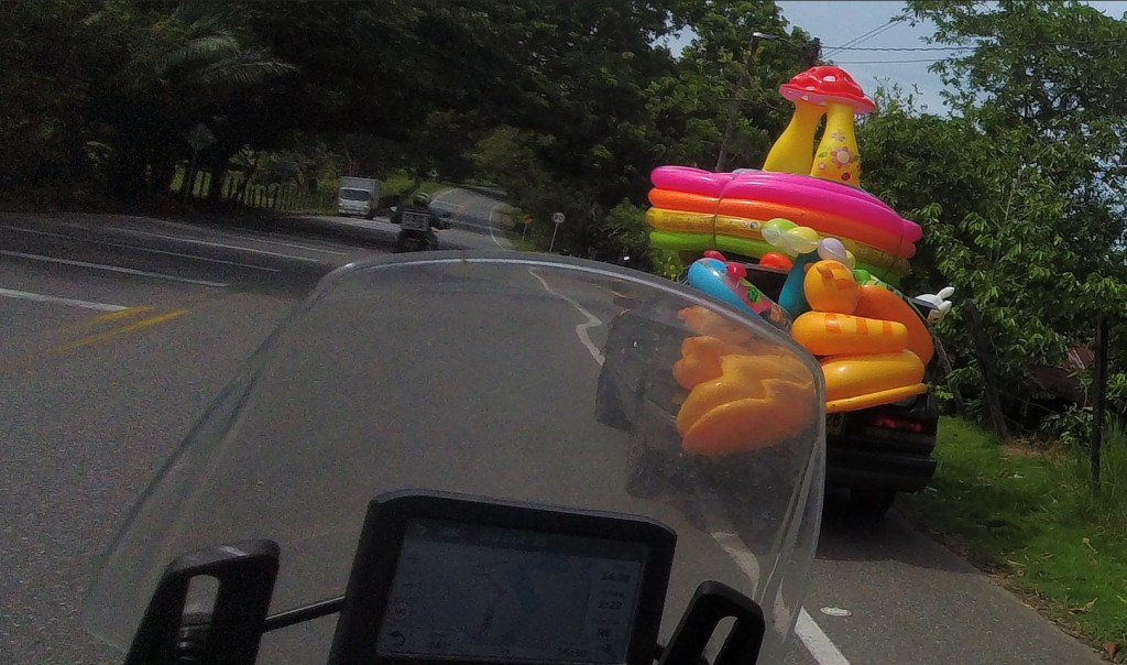 The Medellin experience was basically all about getting the bikes out of the country. The web-based system hadn’t specified the bikes departure date; we’d assumed it was our departure date rather than the bikes so 5th June was the popular choice. Turned out that the bikes weren’t leaving until 20th June earliest, so would be living under expired permits. Hence we headed to the Bureau of Customs down in Dodgetown Medellin, and parked at a public parking facility. The security point passed in the Bureau, we went to the appropriate office to be told there was no appropriate office to meet our needs. Never mind, back to the hotel and Garmin destroyed our competition; Cindy, David and I arriving way before everyone else. Then the longest lunch in tour history, the Caesar Salad took longer to arrive than it took Caesar to decide to cross the Rubicon. Never mind, a few drinks and a trip to the supermarket and Medellin was done, no time for the Escobar tour unfortunately.