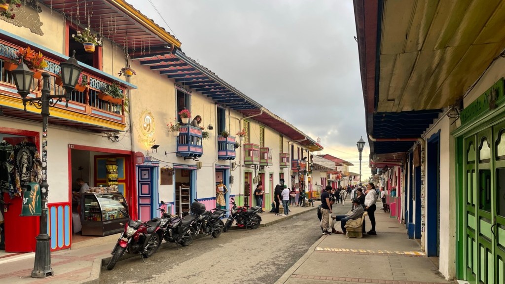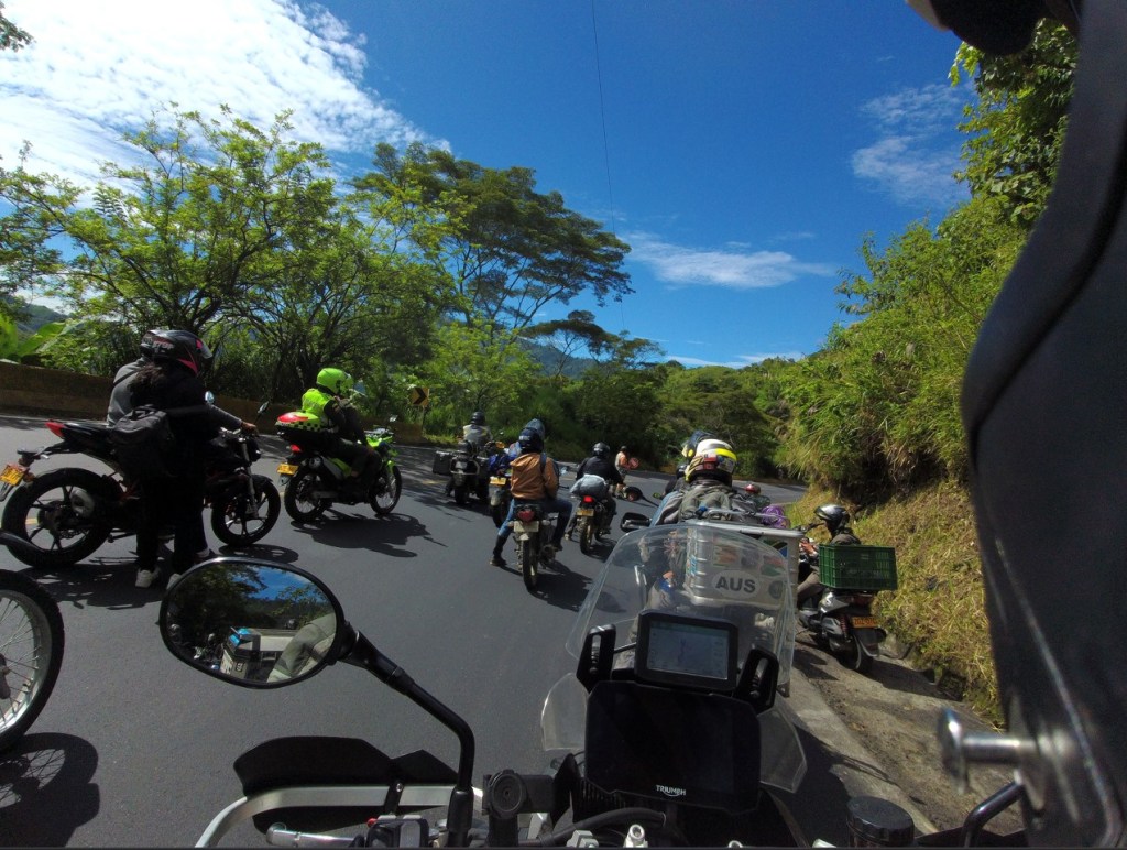 Continuing north-ish on Day 92 we did the now usual Colombian twisting road extravaganza, dodging trucks and traffic as per custom. The navigation was back on Garmin, so therefore completely random with some people suggested to take ridiculous dirt roads while others stayed on the main road. A new lunch tradition had now started – roadside service stations complete with truckies yet somehow lacking fuel – and these enabled the Holy Grail of South American travel to be captured, the Quick Lunch. Australians are used to being able to pull into a servo at 12 noon ± 60 minutes, and while paying for fuel select a fizzy drink and “food” from the awesome display of pies, pasties, sausage rolls, dimmies, chico rolls, things that resemble fish, plain or cheese filled sausages, and chips. Fuel + lunch + bike maintenance = 15 minutes. In South America a road lunch can take 3 hours, with full menu service and wines and utterly random appearance of dishes, usually salads which come out 2½ hours after ordering while the freshly caught and slow-roasted spatchcock came out 3 minutes after the order was placed. But JC had found a loophole – the very limited menu. Chicken, or fish? The restaurant can then just bring the same plates out – problem solved. Into Salento, we’d been warned the hotel was on a street like a precipice so need to be careful parking, but it turned out to be nearly the Salar de Uyuni flat. A very nice little town, plenty of colour and a short walk to the Plaza to try to find Colombian pesos (COPs), which we needed more of once we’d been ambushed by team members on a spree at a local watering hole. Off to dinner, and we prepped for another big city entry day on Day 93.