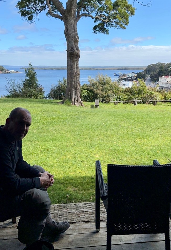 Into Queenstown on the Mt Panorama racetrack down from Gormie, and lunch called. The railway station café was perfect for a nice lasagne, and the journey continued via Zeehan just to have a look at our old stamping ground. It actually looked quite prosperous with the local mines open and operating, and the glorious weather provided a momentary pizzazz although the normal dreary drizzle would quickly shunt Zeehan back into the top 10 worst towns. In Australia, if not the world. Continuing down the very familiar road to Strahan, we went into yet more old stamping ground with a quick trip past our old house before landing at the View 42 hotel. Where we had an upgrade so were presented with a view over the grass down into Strahan Harbour.