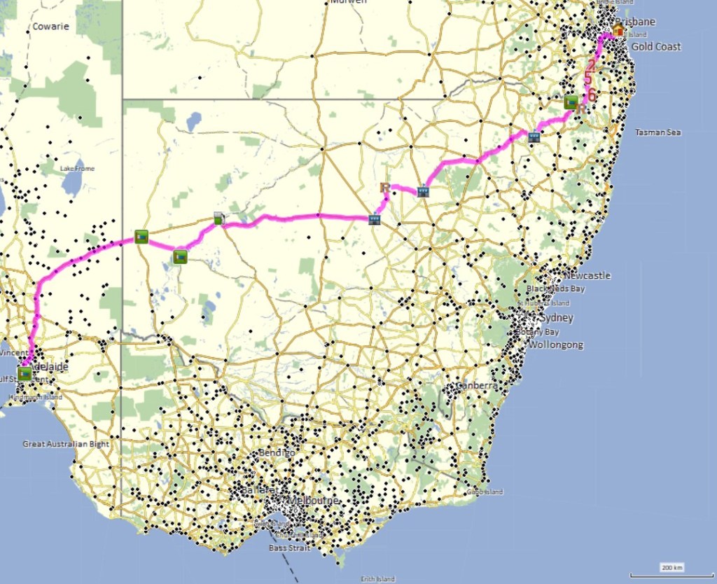 The problem precis – a major conference for which I and co-authors had submitted a technical paper was on in Adelaide, South Australia from 5 – 8 November 2023. A mere 2 riding days later one of our unmissable events – the annual Compass Expeditions reunion – was in Albury on the NSW – Victorian border region. Flying down to Adelaide and back meant that by the time I got home I could not ride to Albury without doing an Iron Butt, and as I have a fear of twilight more related to kangaroos than young vampire hotties, that wasn’t going to happen. So why not just ride the whole way? Cindy can just scoot down the highway to meet me there so as not to miss any work which one of us must do. Problem solved. So onto Step 1, the route planning. Start at home, finish in Adelaide. But relentless highway is to be generally avoided while riding alone and up for some adventure, so which way to go? Strangely, the first days seem most suited to hard-core adventure riding, as the confidence needs building up, and the small roads close to home are more familiar than those in far west NSW or SA. I’ll figure those out when I get there.