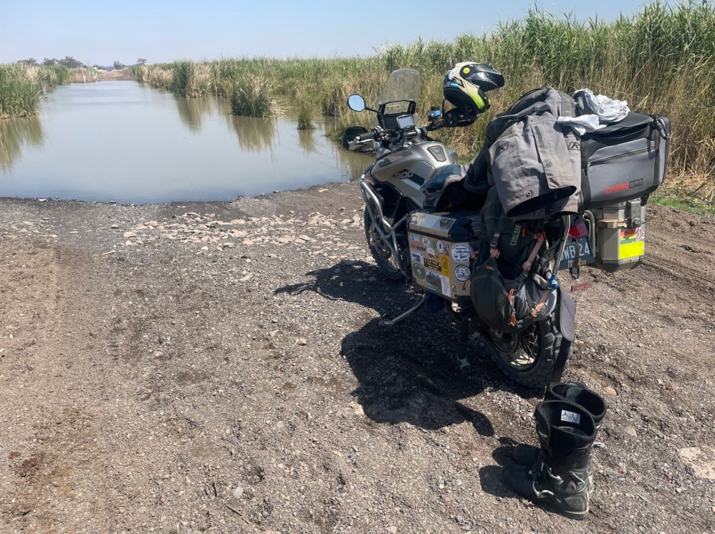 At the other end of the cows were the cowmen, well past being able to claim boys in their title. The chief cowman mentioned that there was water over the road a bit further on, about 400mm deep, but didn’t say how long the section was. He said that a group of motorcycles had been through recently, but didn’t specify whether they were fully kitted up physically and mentally for Dakar or were very pedestrian risk averse ‘just off their prime’ adventure riders. He then said it was OK on the right-hand side. I said I’ll go and have a look, because I definitely don’t want to have to ride back through your cows. About 1km further along there certainly was water over the road. A lot of it, and over 100m across.