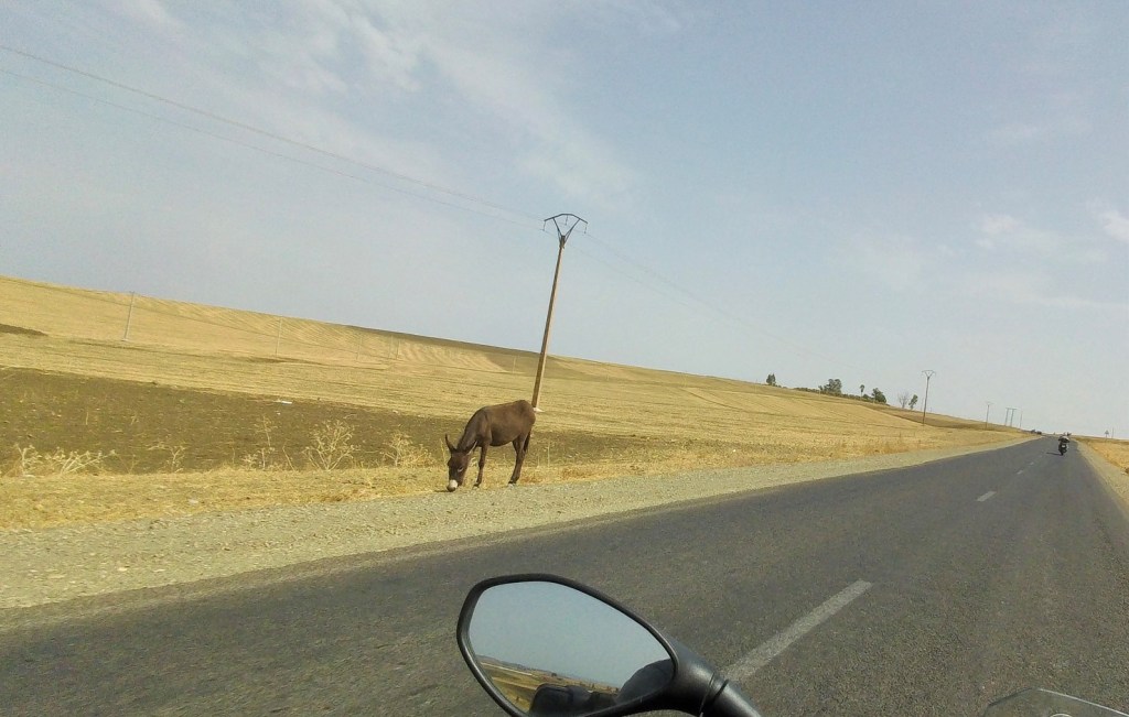 Endless winding roads through some rather odd landscape of small stony ground with trees, including a bit of dusty dirt requiring some on-the-run mode adjustment out of Dynamic and into Enduro – thank heavens for BMWs – and the national parks theme continued into the Ifrane National Park. Once through that, we hit the dreaded main roads into town, including the incredibly slippery round-abouts. At one round-about Cindy actually had to give way to a strolling donkey. But rules are rules.