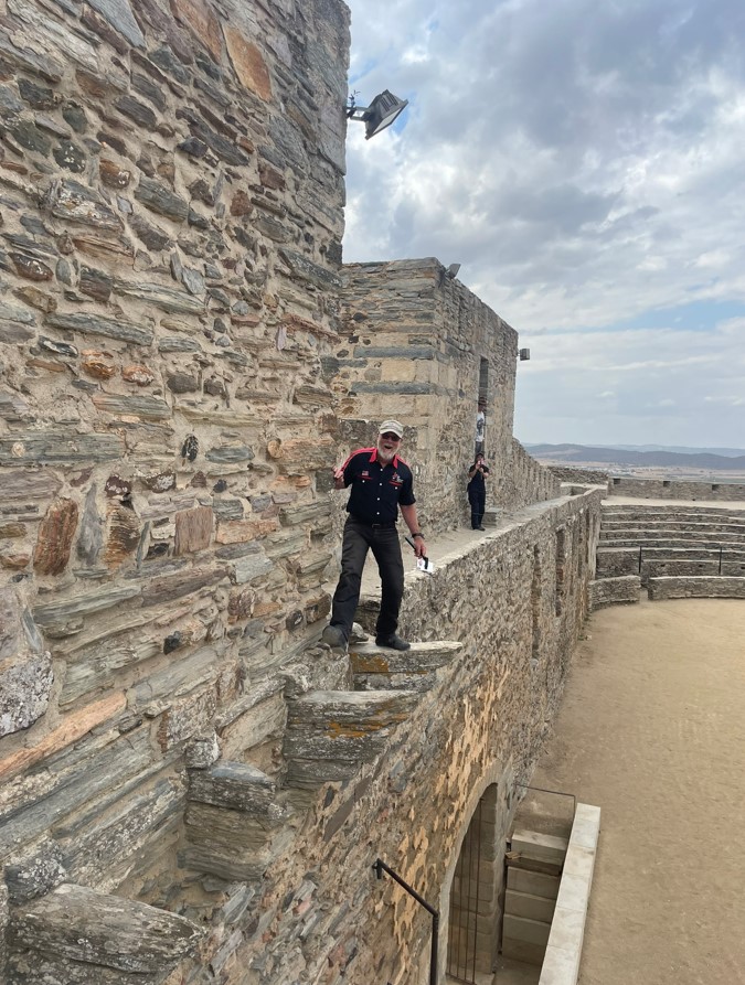 Then suddenly a border sign appeared. No room to park, but everyone did anyway. Photos to celebrate getting back into Portugal, some near misses with traffic, then back on, across a very big dam, and into one of the of the numerous fortress towns for a break. This one was the Castelo de Monsaraz, and parking on the baby-head sized cobbles reminded us that challenging adventure motorcycling was already being planned for back in the 14th century. A wander through the old town, into the bull fighting arena, and ending up in the Inquisition Museum. Cindy then called to say everyone was leaving, which was unfortunate as I was literally at the other end of the town. Never mind, a jog with sweat sluicing down inside every article of clothing, and I made it back to find that I was nowhere near last and could have strolled.