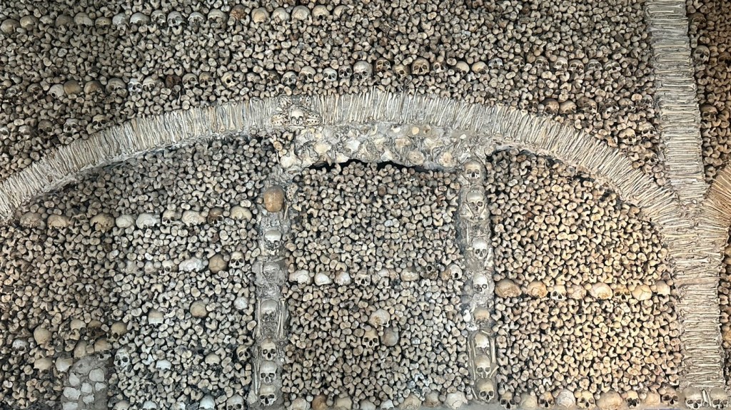 Across into Evora for our final tour night, and yet another excellent hotel, a highlight of this one being our room about 10ft from reception. The tour routine continued – drinks at the bar then off into town for dinner, then read the WhatsApp messages from Julia about what on earth was happening the following day. When the following Day 21 appeared, there was no pressure to leave early as there wasn’t far to go to Lisbon, so we had a look about the town. Evora is famous for a cathedral with an ossuary, the cathedral doesn’t draw many visitors but the ossuary brings in loads. Everyone is interested in bones, especially when there enough of them to make a large chapel. Built by Franciscan monks out of 5,000 skeletons, there were likely skills learned on the job that weren’t easily transferable, and probably weren’t worth highlighting in the resume, unless applying for a position to stock supermarket shelves with lamb shanks.
