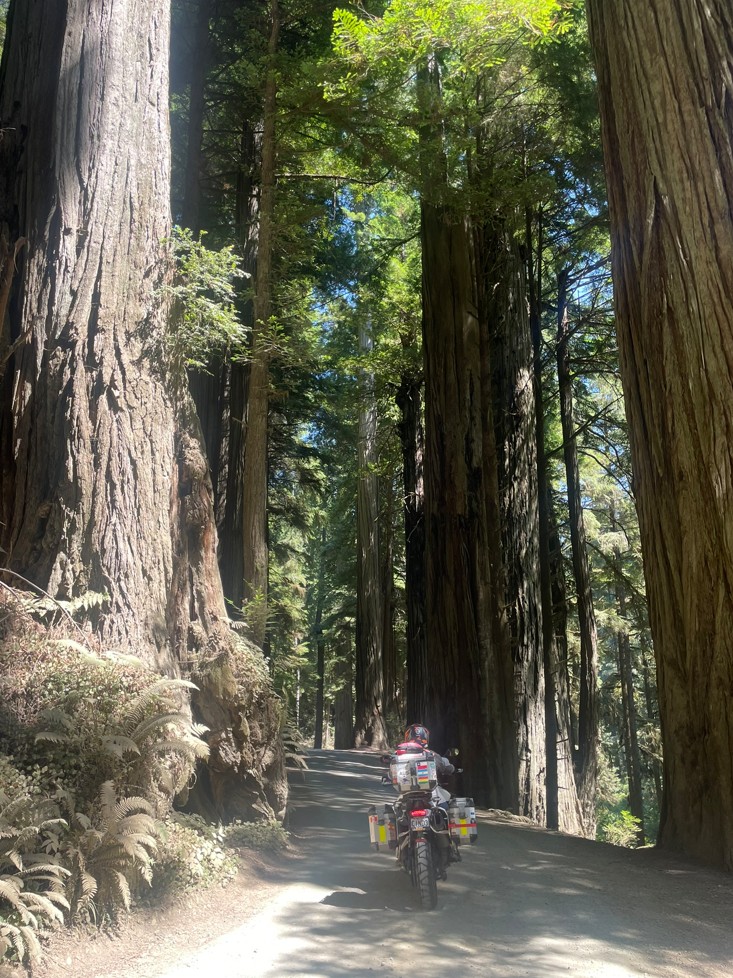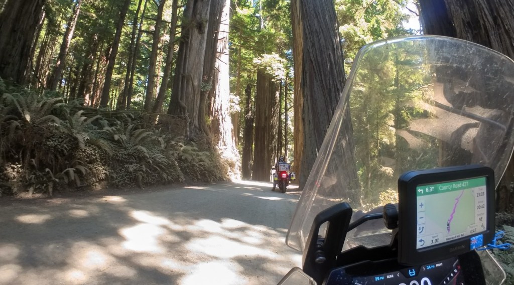 Day 88. Crescent City, just inside the Californian border on the coast. Dennys luncheon. We had started up a conversation with our server. Of course we knew we must be coming into the land of large trees, having just ridden down the Redwood Highway from Oregon. She asked if we’d seen the large trees, not yet was our response. She said she was a local, and in her opinion the Jedediah Smith State Park just out of town was well worth a visit. Just take the Elk Valley Road. Usually by lunch we are running out of excitement about deviating from the day’s plan, but we only had about an hour and a half to go so had to do something to slow down time. Back on and heading down the highway, I saw the turn-off. Shall we do this? Yeah, why not. Up the road, a sign appeared recommending vehicles with trailers not to go any further. Always a good sign for the motorcyclist. Narrow, winding, and suddenly dirt. All alone. But then surrounded by redwoods.