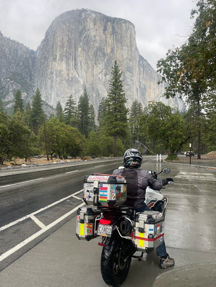 Yes it was still very warm. Questions were asked about whether that was the reason Gino was required to ride one of the two motorcycles, but the rapid cooling as we rode into Yosemite (we insist it is pronounced like Vegemite) scotched such a ridiculous notion. A storm and bucketing rain made it very comfortable besides being wet and in fear of life. But we survived and experienced the amazing entrance to one of the world’s most famous national parks.