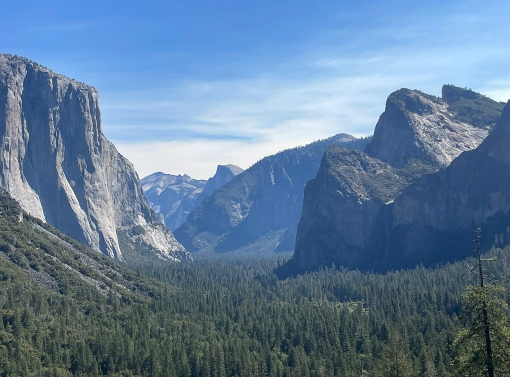 Ensconced and dined, we could enjoy. There were a lot of people as the end of August is prime time, although schools had gone back so there were a lot of foreign visitors. Foreign visitors always cause trouble with their crowding and demanding food and drinks, but we tolerated Kim and Gino due to their contribution to the economy. Day 93 started with a Yosemite orientation tour, so we all loaded onto a flat-bed trailer and off we went. We learned about pine tree species in the floor of the valley, there is the odd Sequoia tree, but they weren’t very big. It is mainly Ponderosa Pine and Incense Cedar. Our guide ensured we were fully trained in recognising the important tree species because our very survival may depend on it if all we had to eat was trees. The scenery is somewhat abrupt in Yosemite, granite just rises vertically everywhere, so the stops to admire it were frequent.