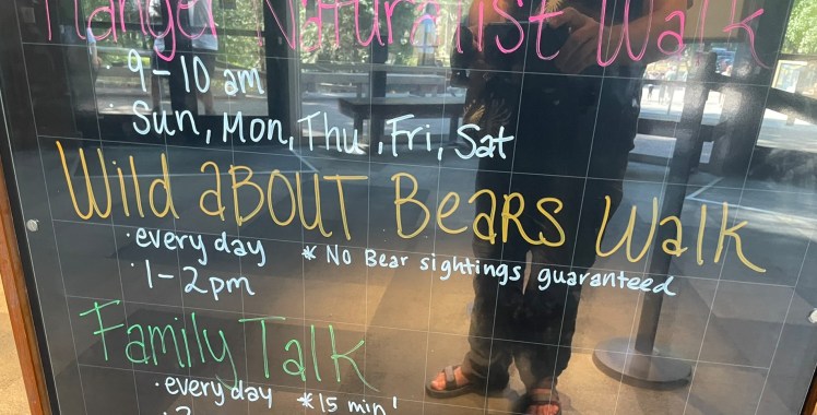 Off we went up the hill toward the famous General Sherman tree, the largest single living thing on earth. The scale is just incredible, we felt like tiny little things amongst all these monsters. The really huge trees are named after presidents and famous generals and other notables, but like the redwoods it is just surreal because so many of the trees are so big. Past the Lincoln tree, the walk suddenly became even more interesting. A bloke passing us and heading the other way said we needed to be careful because there was a bear just up ahead. It wasn’t being aggressive but was quite close to the path. A bear? An actual bear? Could this be our first ever? No-one cared about trees at this point, and in fact we resented them because they completely blocked our view of bears. Why did the National Parks not cut the bloody things down? Then the excitement started building to a crescendo, another chap with a very foreign accent, maybe from eastern Europe or Boston, said to watch out for the bear 200 ft ahead. 200 ft, and there were two huge trees a mere 100 ft away. The excitement level was lifted even higher by the fact the chap had ignored Cindy or vice versa and she was walking between the trees, so 100 ft from the bear. I tried to make her aware of bear. But I didn’t want to frighten it off before I got there so was shouting “Cindy!” at about 40 dBA, equivalent to a soft whisper shout. That didn’t work, so I picked up a pinecone, not one of the enormous sequoia ones but a smaller and less lethal species and threw it. She was 100 ft ahead, and I had done no research on the age v throwing distance for large and highly wind resistant objects. If I had, I would have learned that getting it the 50 ft I achieved was very praiseworthy. Cindy didn’t notice though. Goddamit, either she’d frighten the bear away before I got there or else would be attacked by the bear and I’d feel bad I hadn’t warned her. Either way, I got the photos App ready.