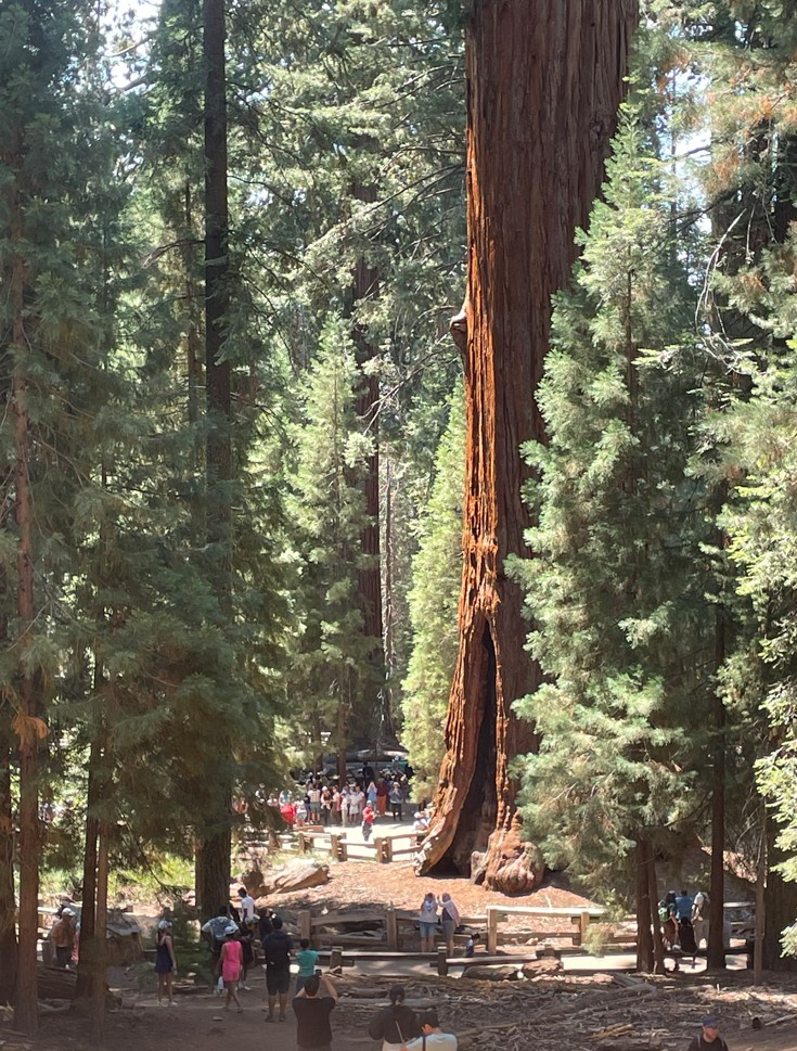 The reason for selecting Springville was that it was advertised as 10 minutes away from the Sequoia National Park. Which is literally true, but a bit like saying “Come and stay in Timbuktu! Only 10 minutes away from the Sahara!” It turned out that Springville was 10 minutes away from the border of the Sequoia NP, but that bit of the park is actually way too low to grow sequoia trees. So Day 96 was in the car back the way we’d come through the endless orange and “What on earth are those?” orchards for 60 miles to get into the actual Sequoia NP, the part where there are actual sequoia trees. Unfortunately, Day 96 was a Sunday on Memorial Day weekend, so getting in was very slow with a queue at the park entrance, then a traffic snarl that went for a long way. Eventually, we arrived at the source of the snarl, Tunnel Rock. Nothing to do with bloody sequoia trees, people would just stop the car on the road and wait for someone else to give up a park, completely blocking the road. All sworn out, we made it to a car park where Gino miraculously snagged one, a bit like winning the Powerball jackpot under the circumstances. There was a huge and slow-moving queue for the loos at the carpark, which seemed odd given there were stacks of the world’s biggest diameter trees to go behind, so we headed up the hill on a walking track to check them out.